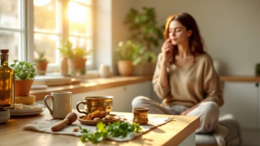 Woman sitting at a kitchen table surrounded by objects representing swapped habits.