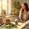 Woman journaling habit triggers in a notebook at a sunlit kitchen table.