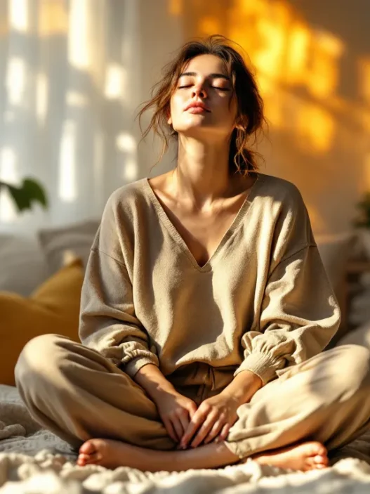 Woman practicing mindful breathing with hands on chest and belly in a calm room.