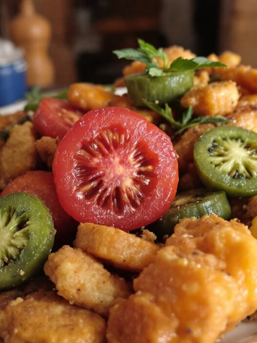 A colorful midday lunch bowl on a sunlit kitchen counter near a clock showing noon.