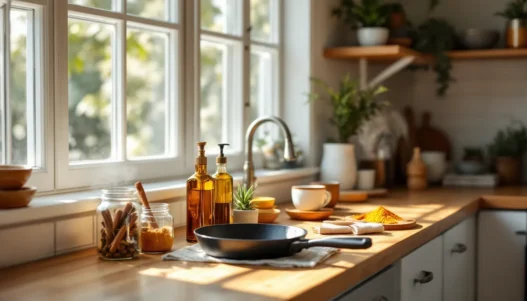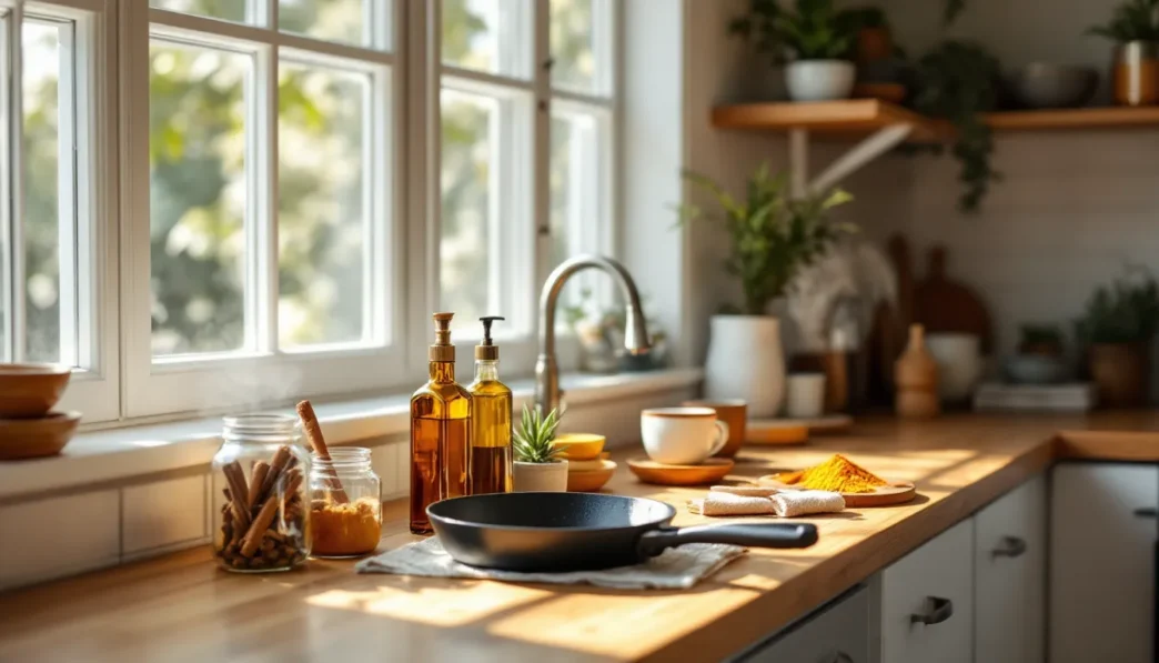 As each conventional product runs out, replace it with something simpler. White vinegar and water handle most kitchen surfaces beautifully. A paste of baking soda works for scrubbing sinks and tubs. For floors, a few drops of real essential oil (not synthetic fragrance) in warm water is surprisingly effective and carries cool, smooth qualities that are calming rather than irritating.