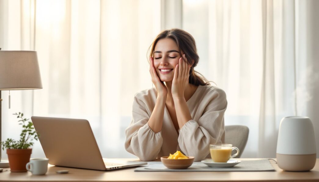 Woman palming her eyes at a desk during a screen break in a sunlit home office.
