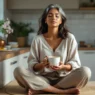 Woman practicing alternate nostril breathing on a cushion in a sunlit room.